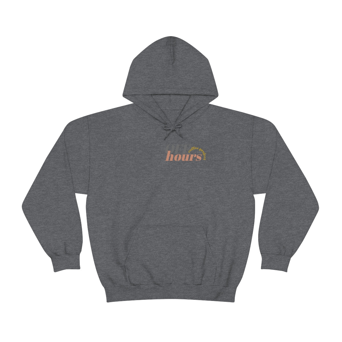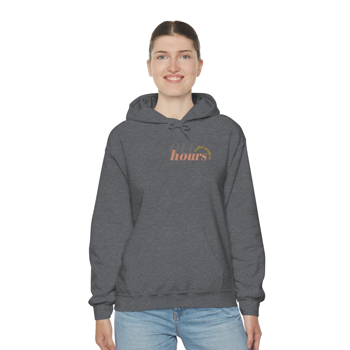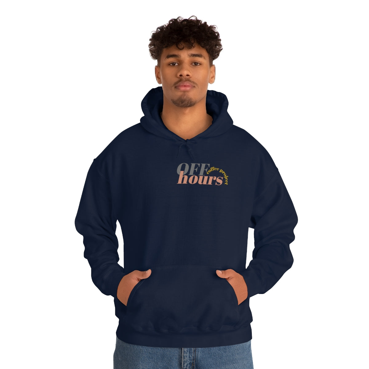 This custom Off Hours Coffee branded unisex heavy blend hooded sweatshirt is relaxation itself. Made with a thick blend of cotton and polyester, it feels plush, soft and warm, a perfect choice for any cold day. In the front, the spacious kangaroo pocket adds daily practicality while the hood's drawstring is the same color as the base sweater for extra style points.